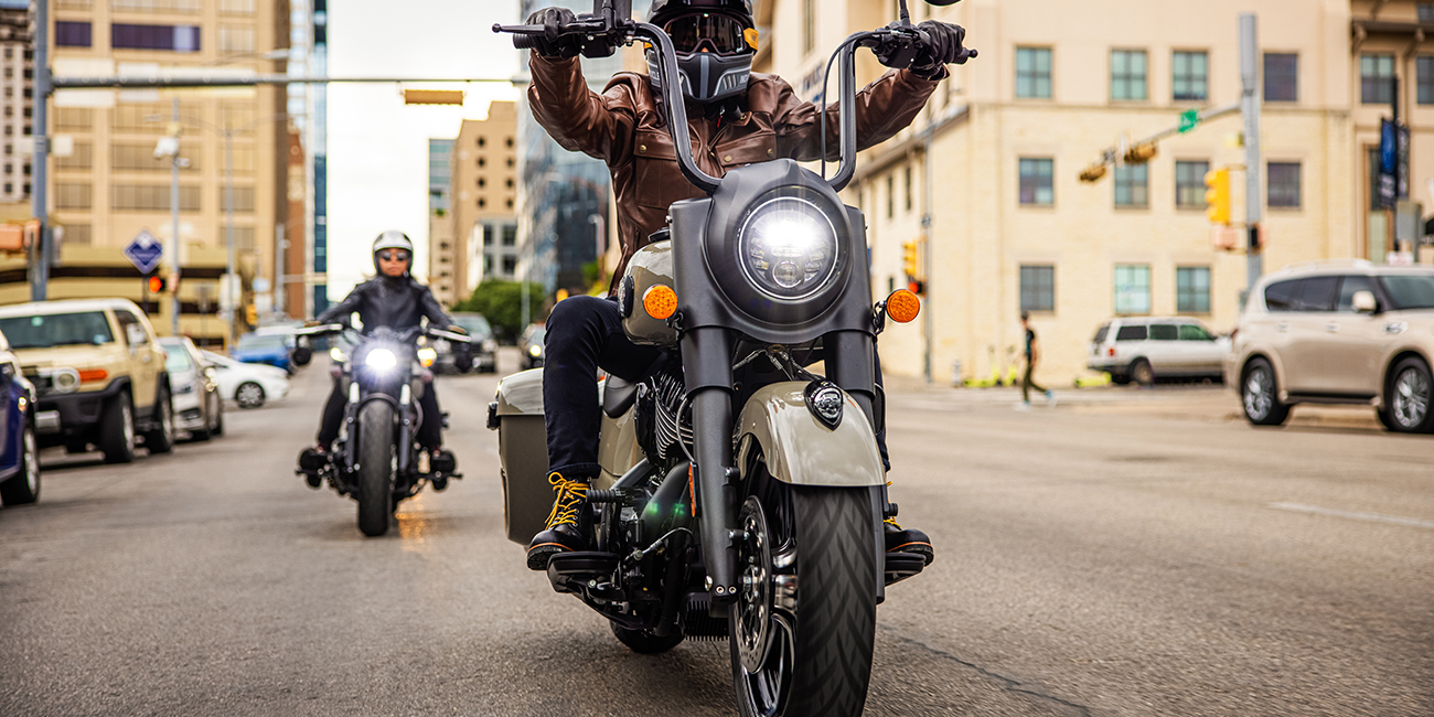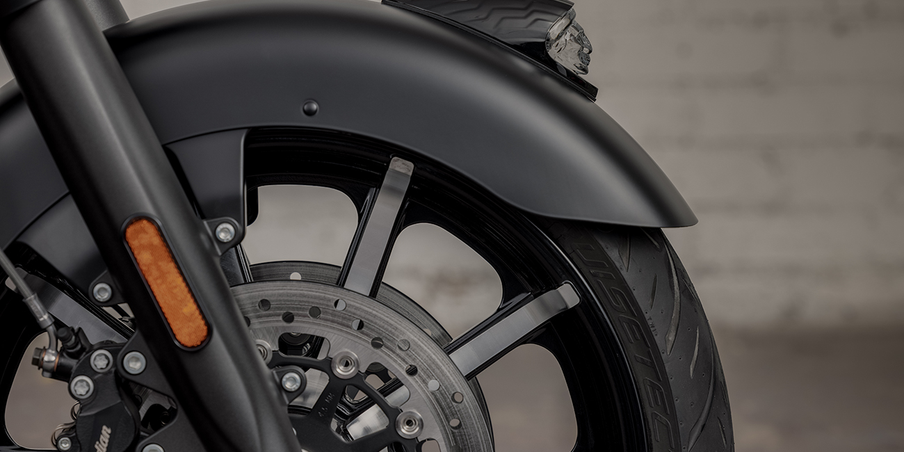 Inspired by the look of custom bikes, an open front fender exposes the 19" 10-spoke contrast-cut front wheel, with the iconic Indian Motorcycle headdress leading the way.