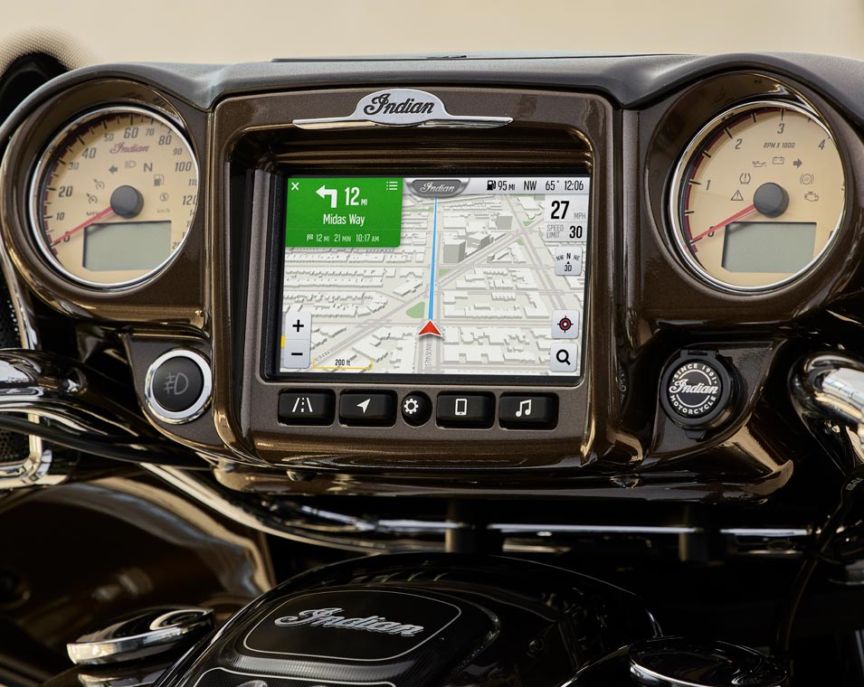 | Infotainment | 7" touchscreen powered by RIDE COMMAND. 7" touchscreen display with real-time clock; ambient air temperature; heading; audio information display; map/navigation; Bluetooth status for phone and headset; vehicle status (tyre pressure, voltage, engine hours, oil change); vehicle info (speed, fuel range, RPM, gear position); current ride data (distance, moving time, stop time, altitude, altitude change); trip meters; ride mode selection; screen brightness; vehicle trouble code readout; Apple CarPlay integration. |